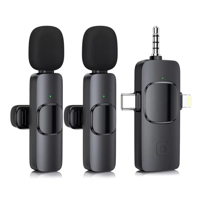 Wireless clip-on microphone set with dual mics and multi-device receiver, offering clear audio, noise reduction, and easy plug-and-play use for