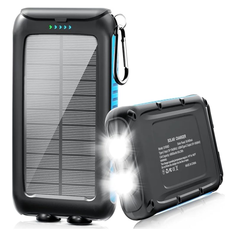 Rugged solar power bank with high-capacity battery, built-in flashlight, and dual charging options, perfect for outdoor, travel, and emergency use.