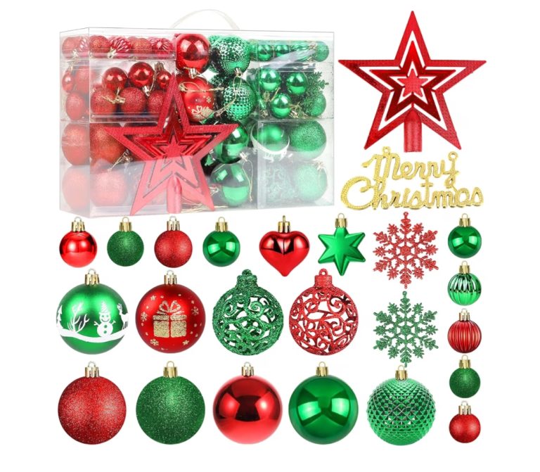 Christmas tree baubles set featuring assorted colors and finishes for festive decorating. Made from shatterproof material, lightweight, and easy to