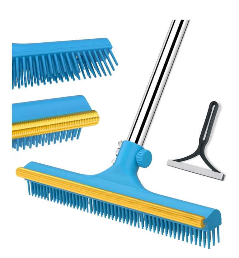 Durable carpet rake designed to lift and remove stubborn pet hair, dirt, and debris from carpets and rugs. Easy to