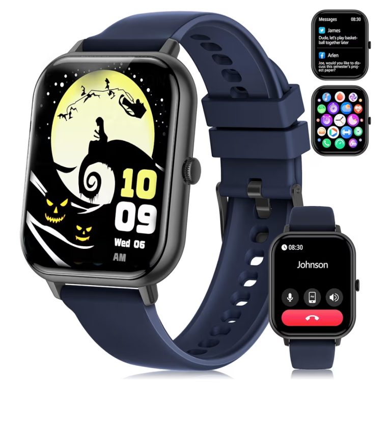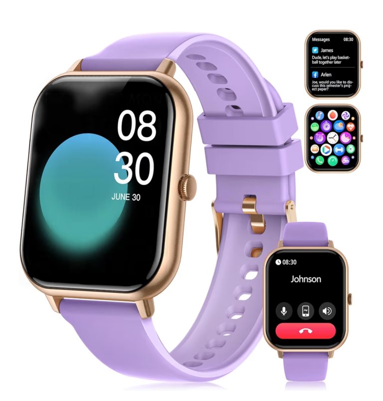 Smartwatch with full-touch display, fitness tracking, heart rate monitoring, and call/message notifications for everyday convenience and health management.