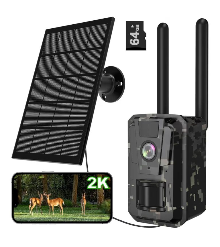 Solar wildlife camera with built-in solar panel for continuous power. Captures clear photos and videos with motion detection, night vision,