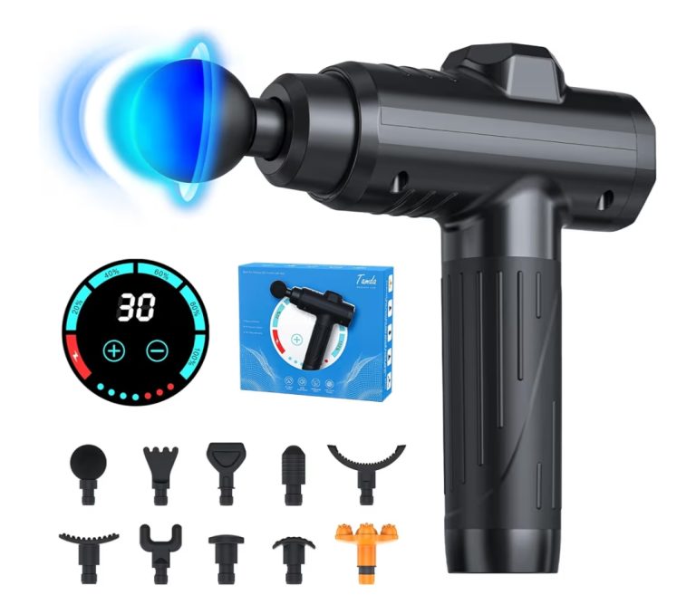 Massage gun with powerful percussion therapy to relieve muscle pain and stiffness. Features multiple speed levels and interchangeable heads, lightweight