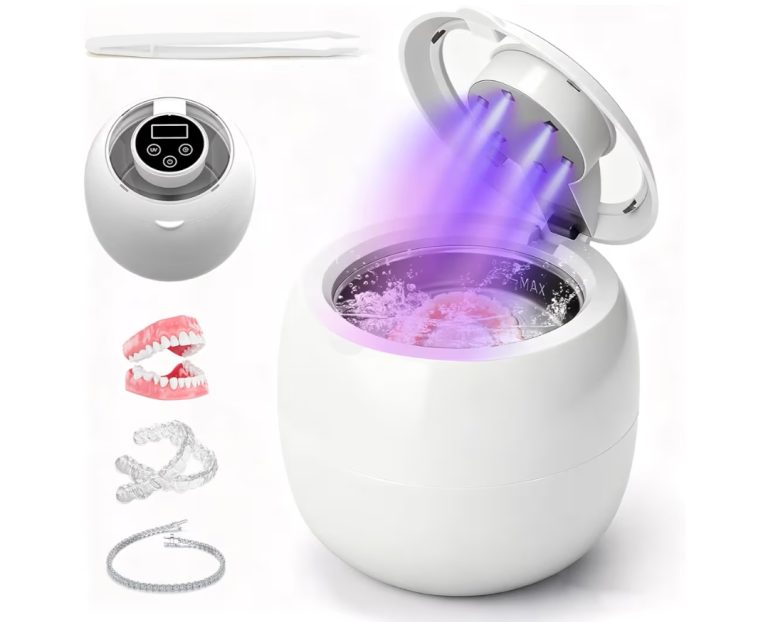 A compact ultrasonic retainer cleaner that uses high-frequency vibrations to remove plaque, stains, and bacteria from retainers and dental appliances.