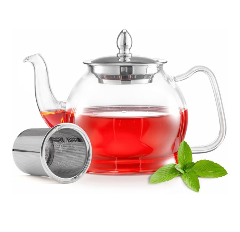 Elegant heat-resistant glass teapot featuring a stainless steel infuser for loose-leaf tea. Offers clear visibility, easy pouring, and a stylish
