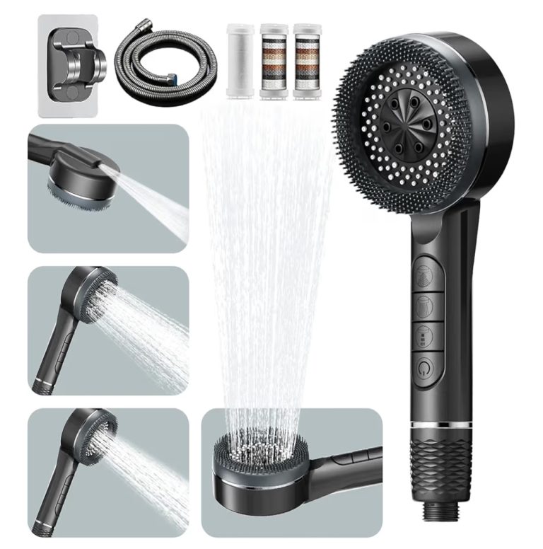 High-pressure shower head – Multi-mode shower head with strong water flow, built-in filtration beads, and a silicone massage brush. Includes