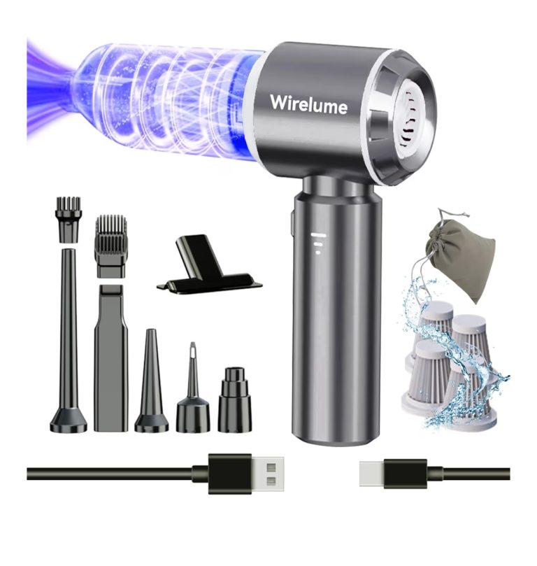 Powerful rechargeable air duster that blasts strong airflow to clean keyboards, PCs, consoles, and tight spaces—eco-friendly alternative to canned air.