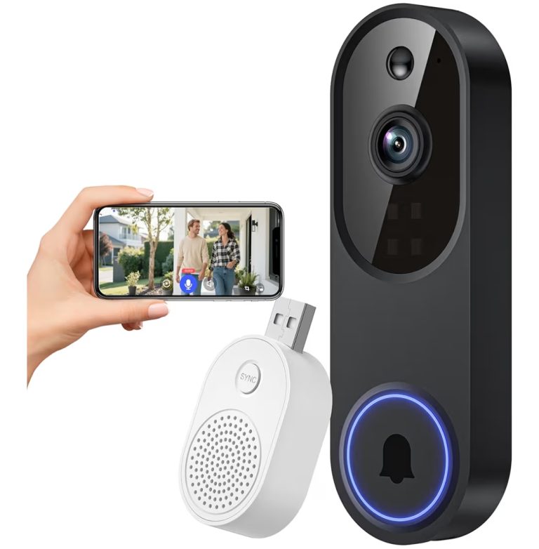 A video doorbell that lets you see, hear, and talk to visitors from your phone. It features motion alerts, night