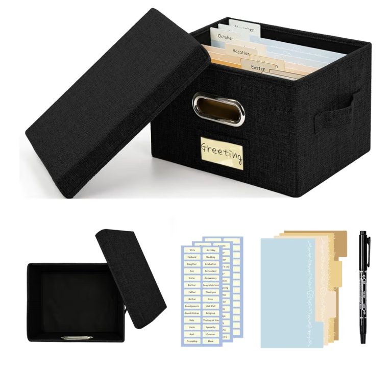 Keeps greeting cards neatly sorted and protected in one place. Easy to use, space-saving design with multiple compartments for quick