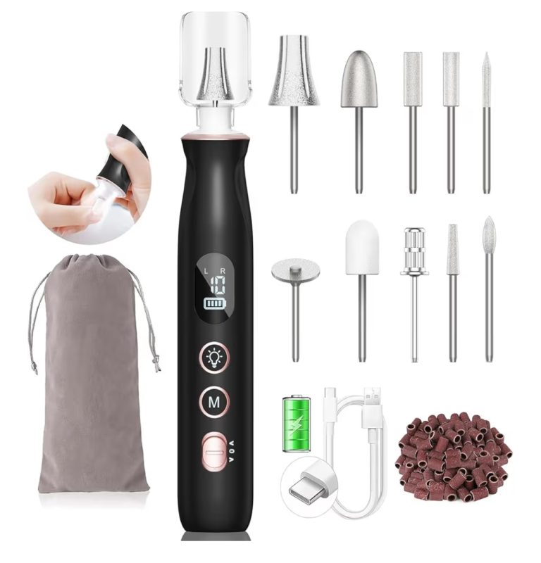 A handheld, motorized tool designed for filing, shaping, and polishing nails quickly and precisely, ideal for manicures, pedicures, and professional
