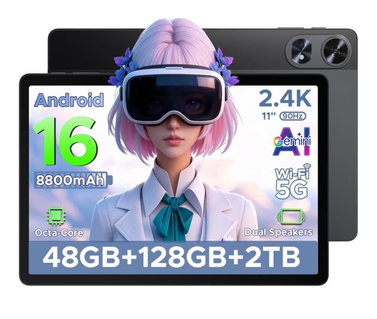 11″ Android 16 tablet with 2.4K display, 8800mAh battery, 48GB+128GB+2TB storage, 5G Wi-Fi, dual speakers, and Octa-Core AI performance.