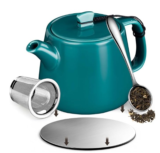 Teapot with built-in strainer for easy brewing of loose tea. Heat-resistant design with comfortable handle, perfect for making fresh and