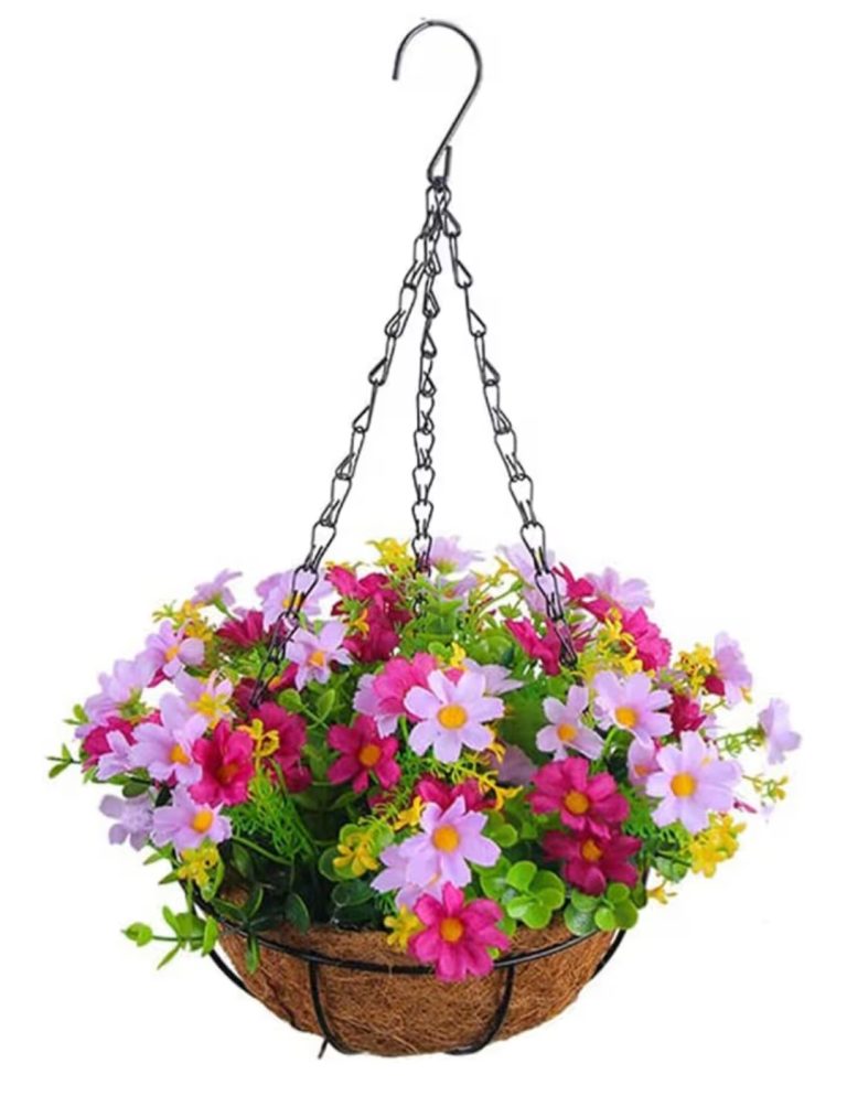 Hanging flower basket with sturdy metal chain and coco liner. Perfect for displaying plants and flowers indoors or outdoors, adding