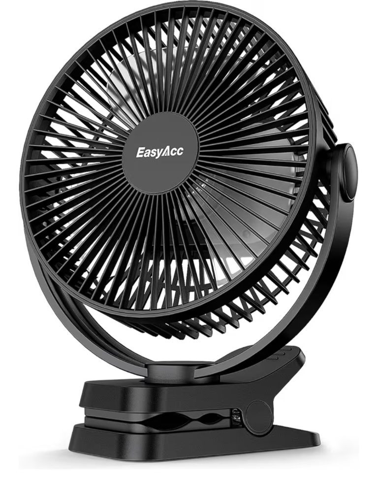 Rechargeable clip fan with strong airflow and adjustable speeds. Compact design with sturdy clamp, LED display, and long battery life—perfect