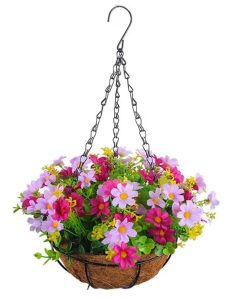Hanging flower basket with sturdy metal chain and coco liner. Perfect for displaying plants and flowers indoors or outdoors, adding a beautiful decorative touch to