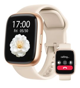 Stylish smart watch with a sleek gold frame and soft silicone band featuring a full-touch display, call function, fitness tracking, heart rate monitoring, and message