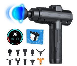 Massage gun with powerful percussion therapy to relieve muscle pain and stiffness. Features multiple speed levels and interchangeable heads, lightweight design, and long-lasting battery—ideal for