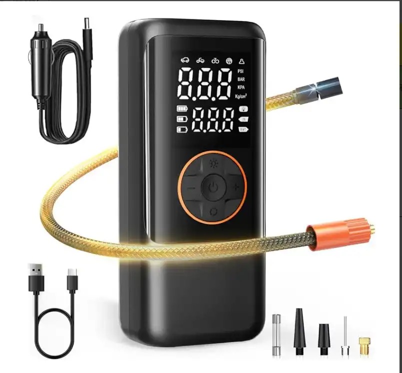 The Flowood tire inflator compressor is a compact, portable device designed for quickly inflating car, bike, and other vehicle tires. It typically features an easy-to-read pressure gauge or digital display, a built-in LED light for nighttime use, and various nozzle attachments for versatility. Ideal for emergency roadside assistance and home use, it offers convenience, efficiency, and reliable performance.