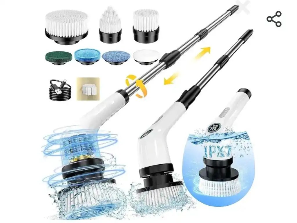 An electric spin scrubber is a cordless cleaning tool with a rotating brush head designed to remove dirt, grime, and stains from various surfaces. It is commonly used for cleaning bathrooms, kitchens, floors, and other hard-to-reach areas with minimal effort. Many models come with interchangeable brush heads and adjustable handles for versatile cleaning.