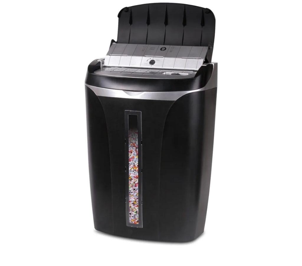 This shredder can handle up to 14 sheets of 20-pound bond paper at once, reducing them to 5 by 38 mm particles. It also shreds credit cards, CDs, and junk mail. The device operates at a low noise level of 58 dB and includes a 6.6-gallon bin with a transparent window for easy monitoring. It features auto start/stop and manual reverse functions to simplify operation and jam clearing. The shredder runs continuously for up to 5 minutes before requiring a 30-minute cool-down period.