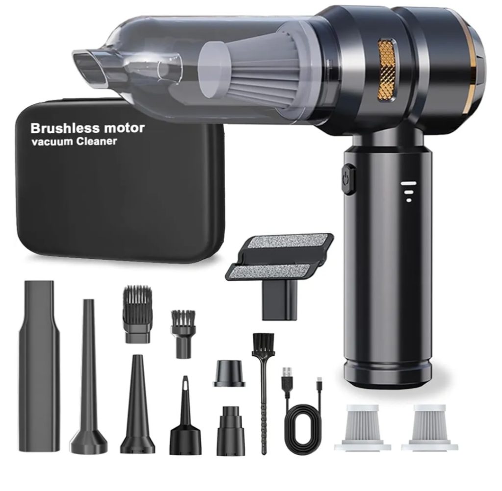 The DiliDala Car Vacuum Cleaner is a versatile, portable device designed for efficient vehicle cleaning. Equipped with a powerful 120W brushless motor, it offers up to 22,000 PA suction power, effectively removing dust and pet hair from cars, sofas, and floors. Its 4-in-1 functionality includes vacuuming, blowing, inflating, and vacuum compression, making it suitable for various cleaning and maintenance tasks. The cordless design, weighing only 0.82 pounds, ensures easy maneuverability, while the rechargeable 10,000mAh battery provides up to 40 minutes of continuous use after a 3-hour charge. Additionally, the detachable dust box and washable HEPA filter facilitate convenient cleaning and maintenance.