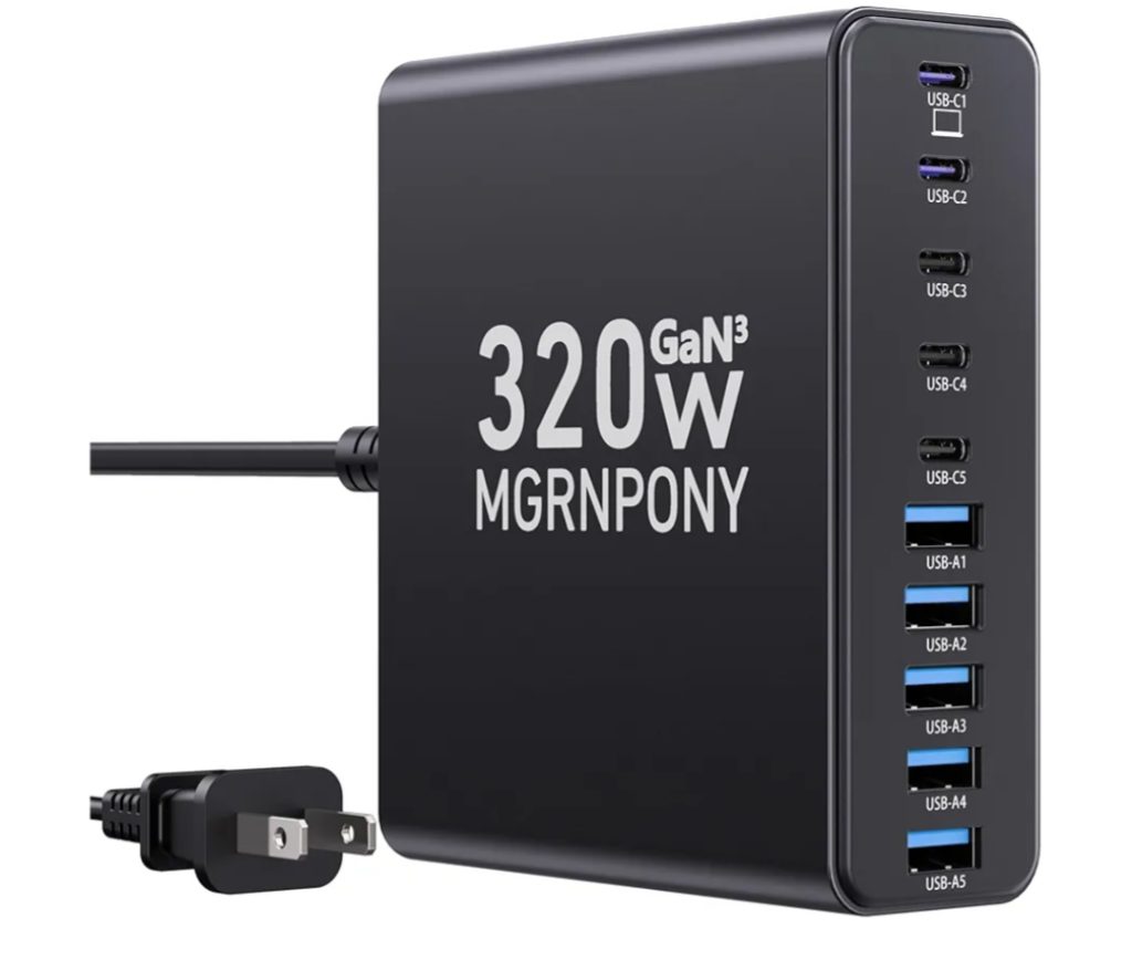 A 320W USB-C charger is a high-power charging adapter designed to fast-charge multiple devices simultaneously. It typically features multiple USB-C and USB-A ports, supporting high-speed charging for laptops, tablets, smartphones, and other USB-powered devices. Ideal for power users, it ensures efficient and safe charging with built-in protection against overheating, overcharging, and short circuits.