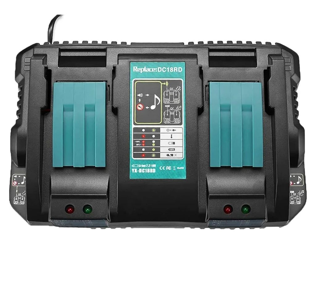 The Bonadget 6A DC18RD Dual Fast Battery Charger is designed to charge two 14.4V to 18V lithium-ion batteries simultaneously, compatible with models such as BL1830, BL1840, BL1850, and BL1860. It features a rapid charging system with an output current of up to 4A, enabling efficient charging times. The charger includes a cooling fan to maintain optimal battery temperature, LED indicators to display charging status, and a fully charged sound alert. It also offers protection against overcharging, overheating, and overloading, ensuring safe and reliable operation.