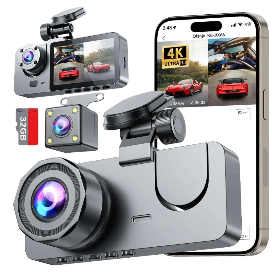 A 4K HD front and rear dash cam is a dual-camera system for vehicles that records high-resolution video from both the front and rear views. It provides clear footage for evidence in accidents, parking incidents, or on-road events, enhancing safety and security while driving.