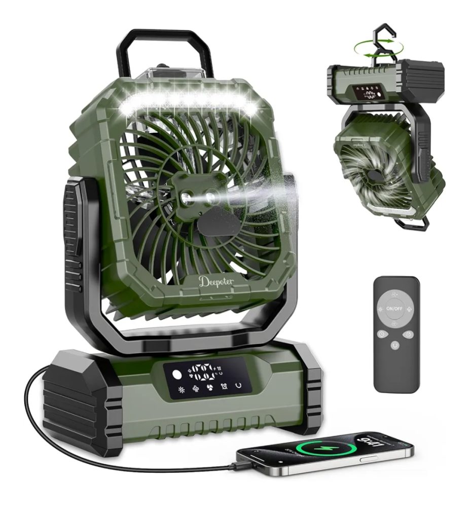 “Portable camping fan with built-in LED light, offering powerful airflow and adjustable brightness. USB rechargeable and perfect for tents, outdoor adventures, or emergency use.”