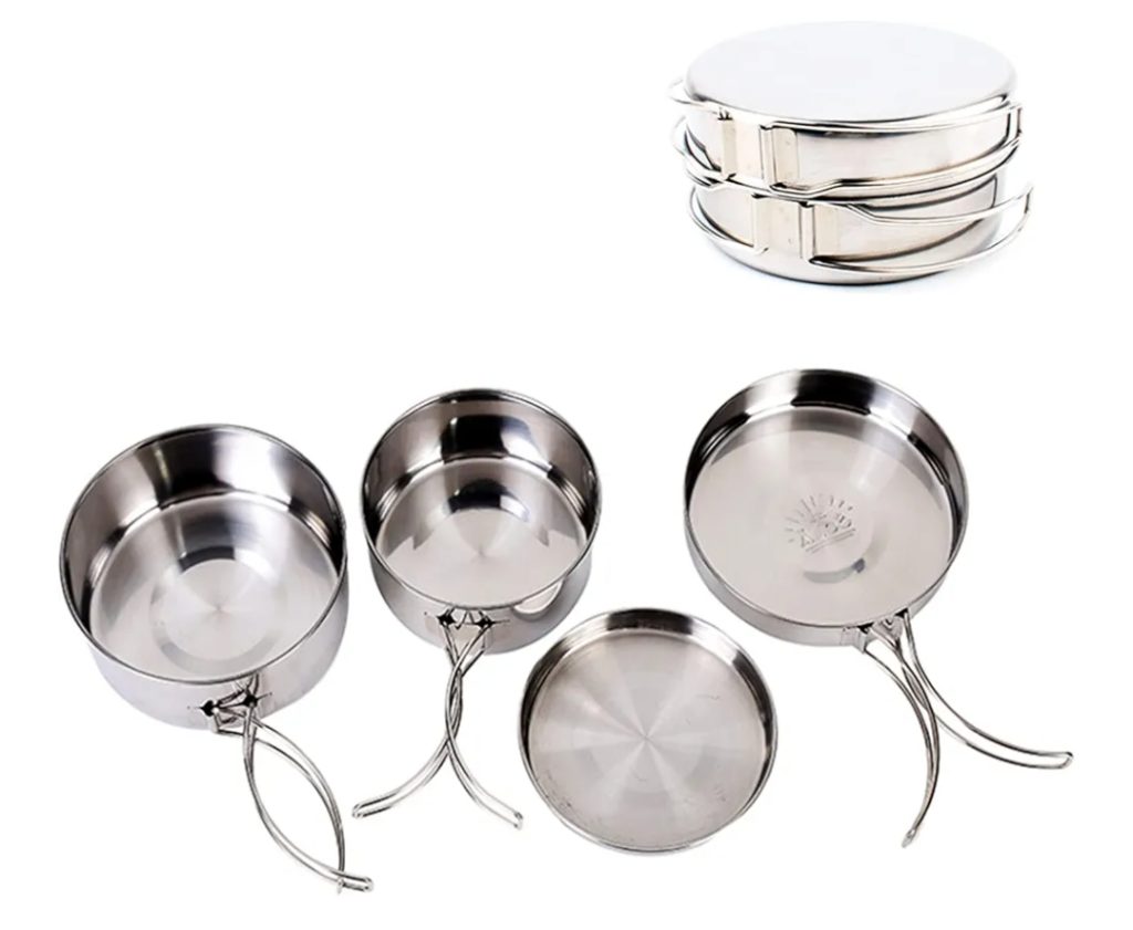 Camping cookware is a set of lightweight, durable cooking tools designed for outdoor use. It typically includes pots, pans, utensils, and sometimes portable stoves, all built to withstand campfires or portable burners. Ideal for hikers, campers, and backpackers.