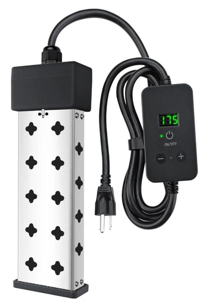 Immersion water heater quickly heats water by submerging the rod directly into buckets, tubs, or containers, providing a portable and efficient heating solution.