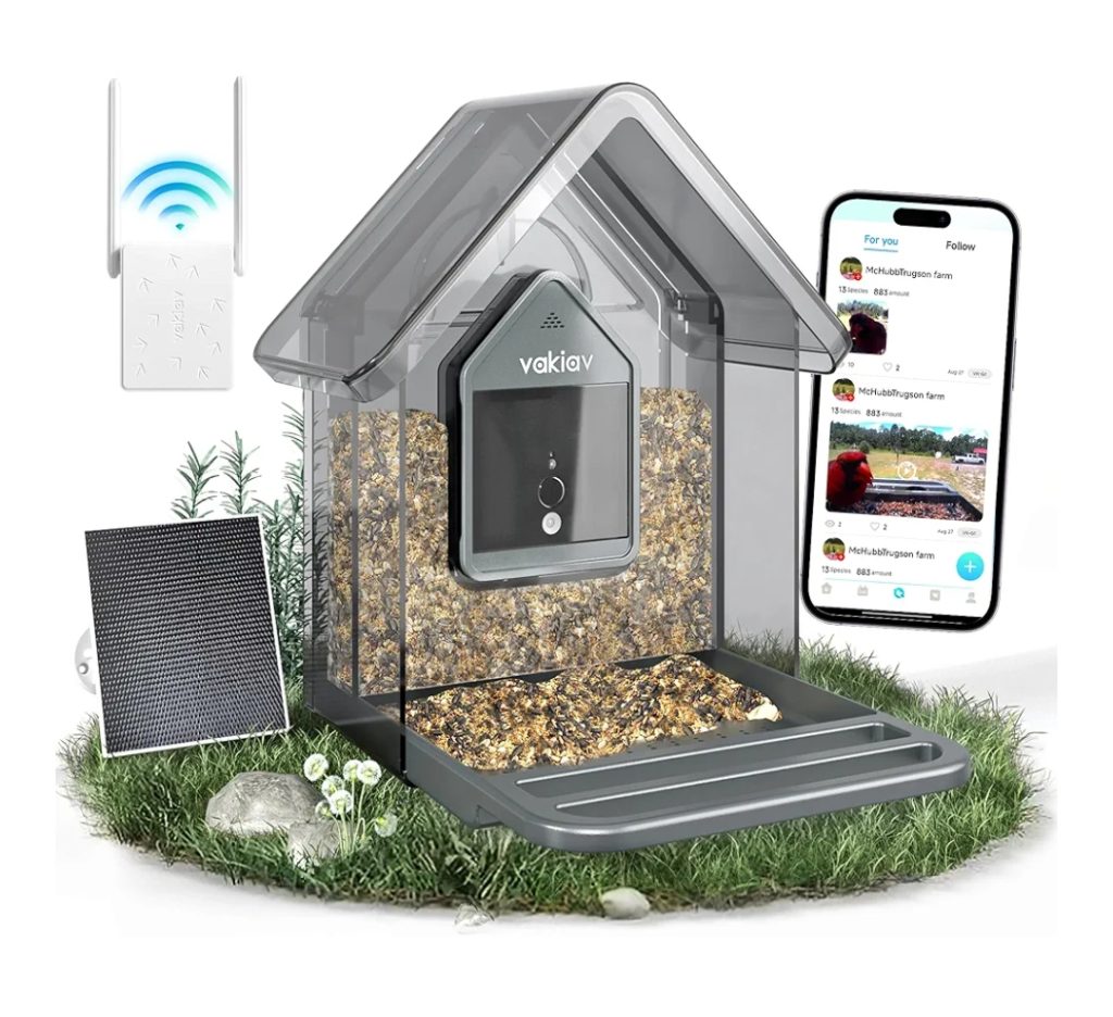 Smart bird feeder with HD camera, solar charging, and WiFi app control, allowing you to watch and capture birds in real time from your phone.
