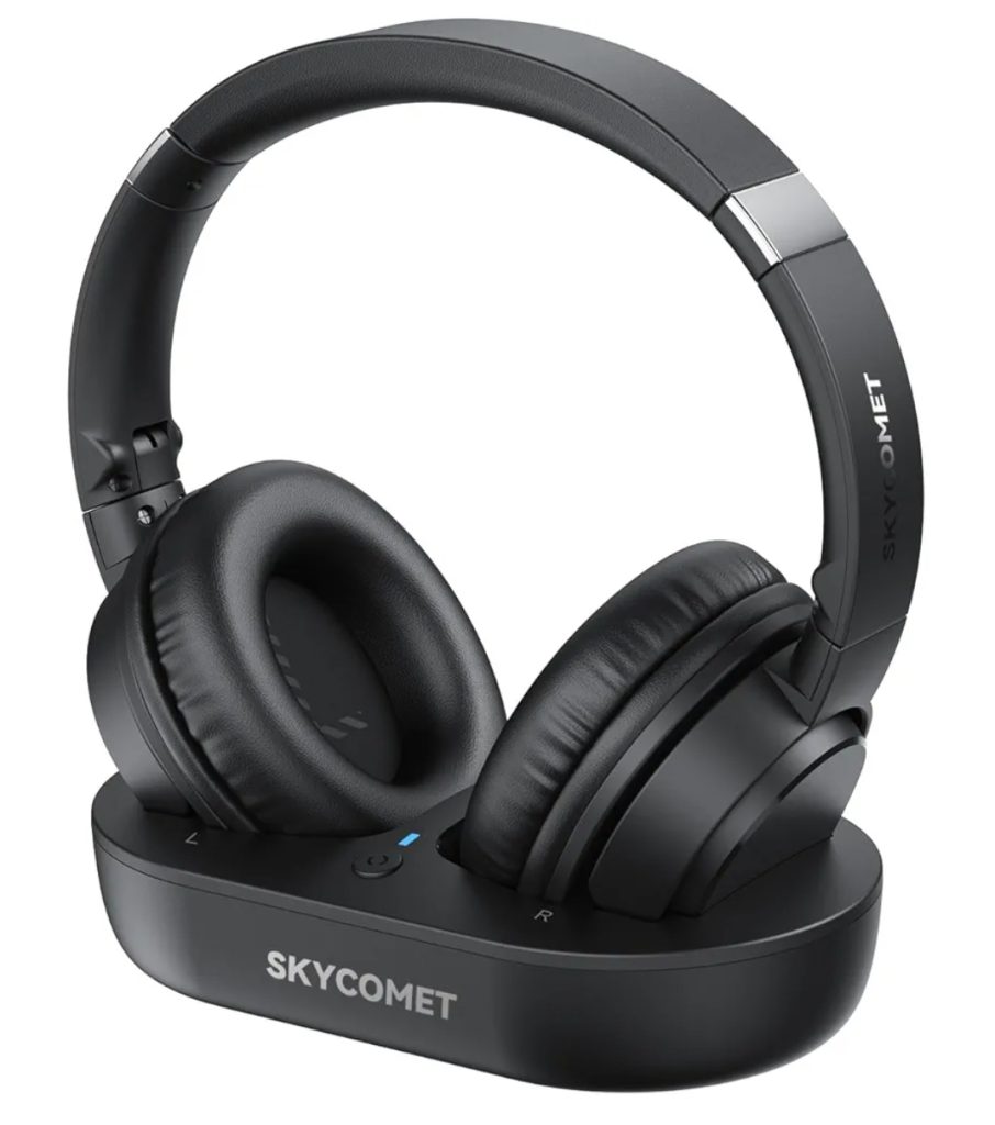 Wireless over-ear headphones with charging dock, delivering high-quality sound, comfortable fit, and long battery life for music, calls, and entertainment.