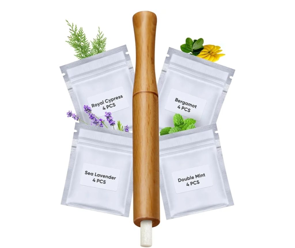 Aromatherapy inhaler set with 4 refreshing scents — Royal Cypress, Bergamot, Sea Lavender, and Double Mint. Features a sleek wooden holder for natural, portable relaxation and stress relief.