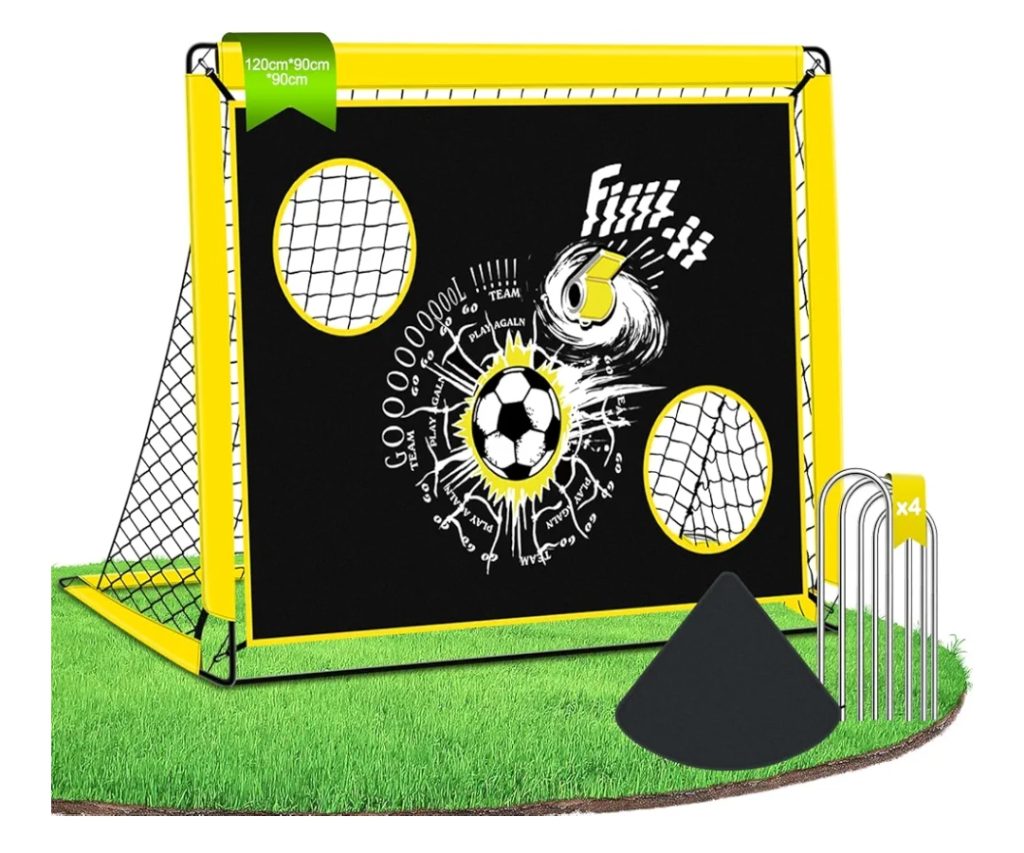Soccer Training Goal Target Net — Durable 120×90 cm football goal with target sheet for precision shooting practice. Features multiple target holes, sturdy steel frame, and ground stakes for stability — perfect for improving accuracy and fun backyard play.