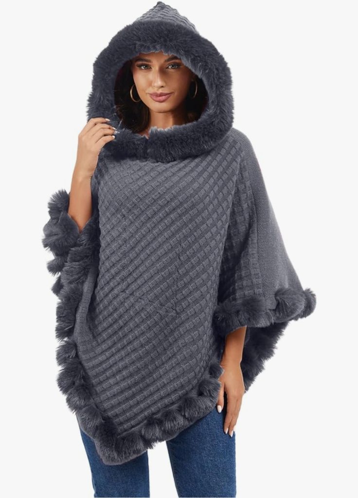 Cozy knit poncho with faux fur trim and hood, featuring a soft textured design for warmth and style. Perfect for layering in cold weather.
