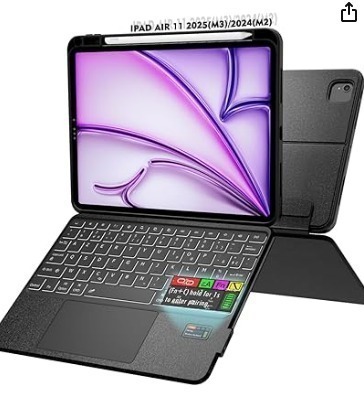 iPad Air 11 case with detachable Bluetooth keyboard, touchpad, and adjustable stand—offers laptop-style typing and full protection for 2025 (M3) and 2024 (M2) models.