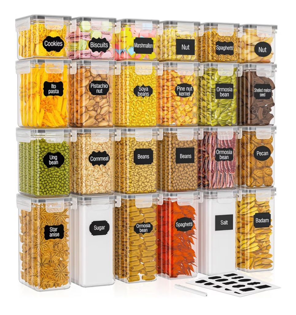 24 Pack Food Storage Containers – Durable, airtight containers perfect for storing leftovers, meal prep, snacks, spices, and freezer items. Comes in assorted sizes with leak-proof lids to keep food fresh and organized. Microwave, freezer, and dishwasher-safe – ideal for kitchen, fridge, and lunch on the go.