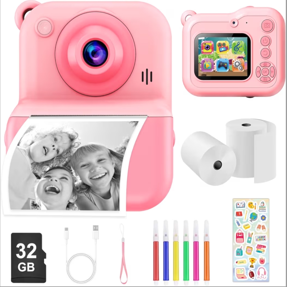 Cute instant print kids camera with built-in thermal printer for quick black-and-white photos. Features fun filters, frames, and easy buttons for little hands. Encourages creativity with photo, video, and selfie modes. Safe, durable design — perfect for gifts, parties, and capturing childhood memories. Includes paper rolls.
