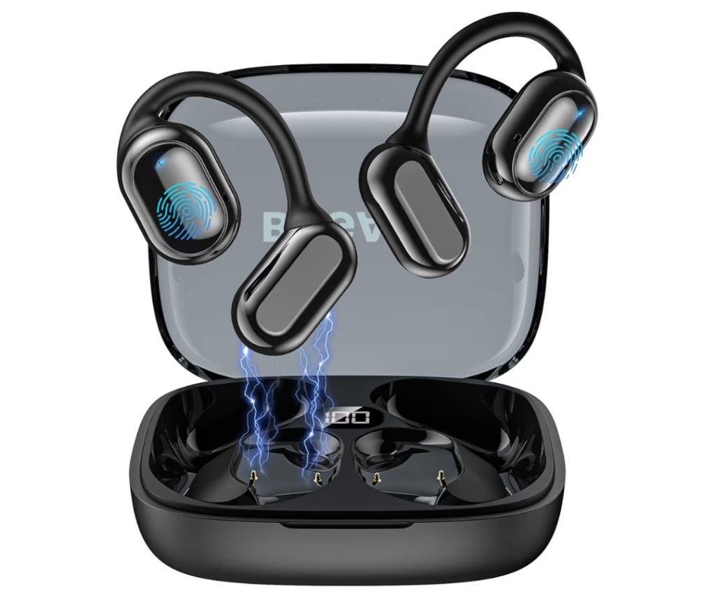 Lightweight open-ear earbuds with airy, comfortable fit, clear sound, and awareness of surroundings—perfect for running, workouts, and everyday use.