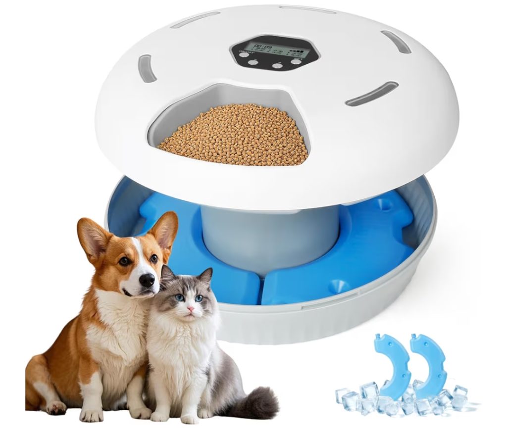 Automatic cat feeder: A smart pet feeder that dispenses food on a set schedule, keeping your cat fed on time even when you’re away. Features portion control, large food storage, and optional app control for easy monitoring.