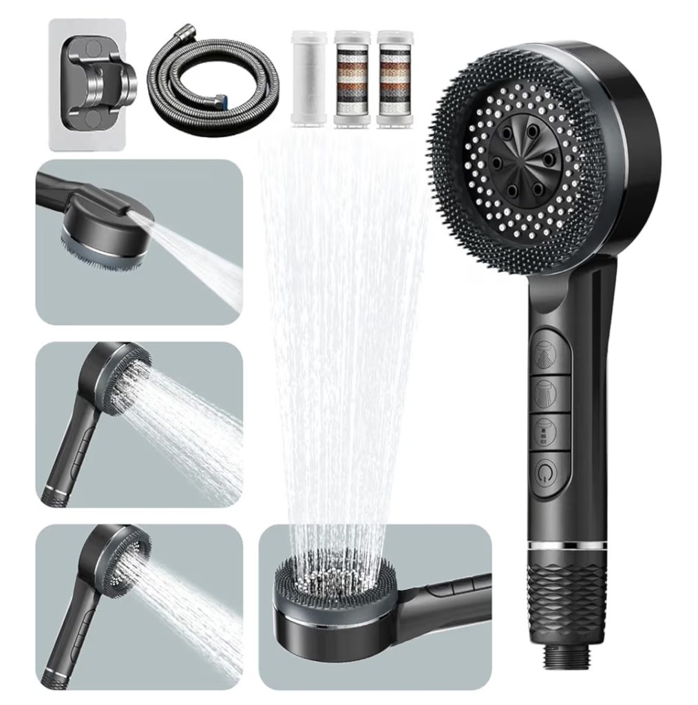 Pet shower head: A multifunction pet shower sprayer with built-in grooming bristles, strong water pressure, and adjustable spray modes. Helps you wash, massage, and deep-clean your pet more easily, while the included filters keep the water cleaner and gentler on their skin.